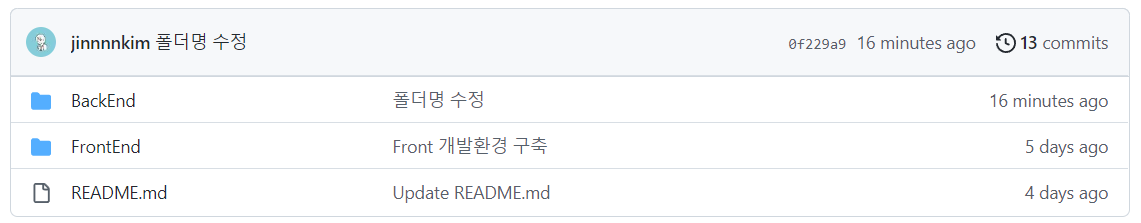 처음에 하위 폴더를 backend로 커밋였으나 팀 규칙인 카멜 법칙을 따르기 위해 BackEnd로 폴더명을 수정해야 했다.