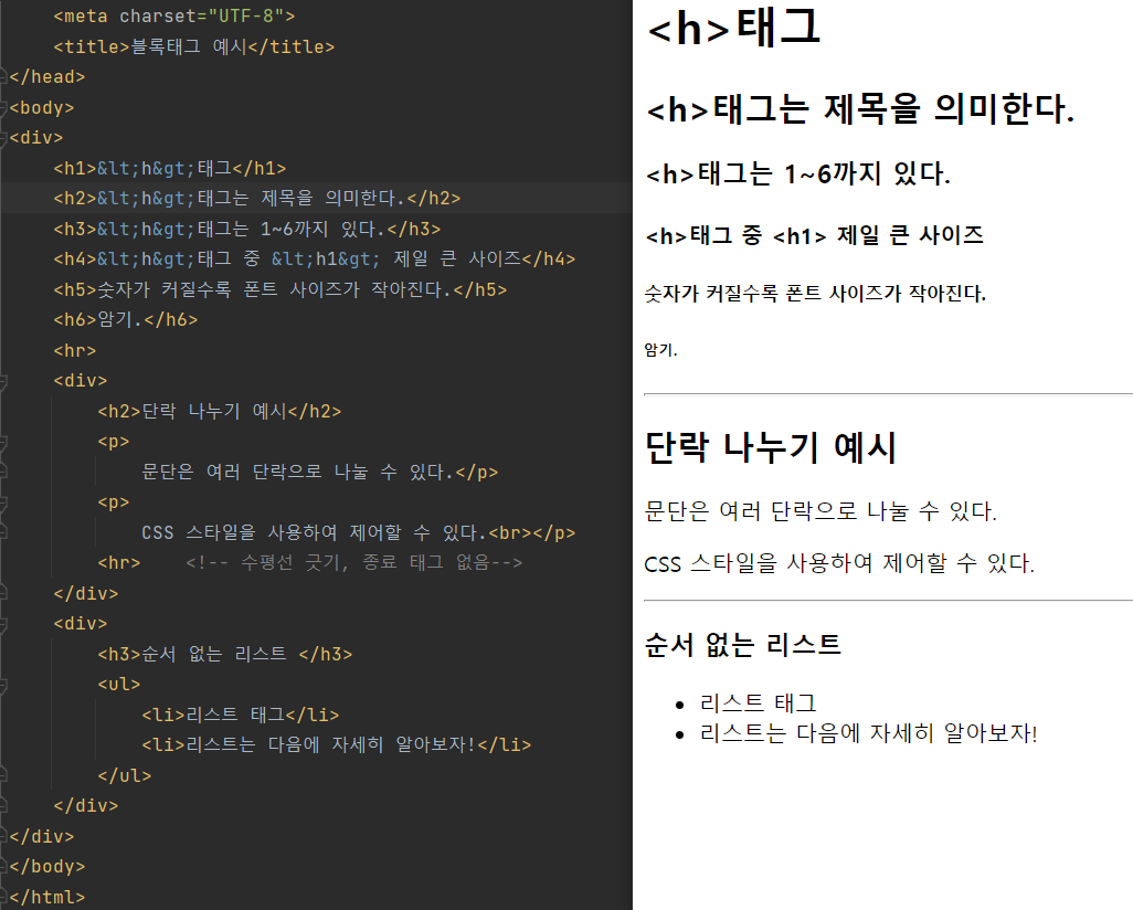 <h> : 문단 제목(장, 절, 소제목 등), 제목의 글자 크기는 브라우저가 결정하며,