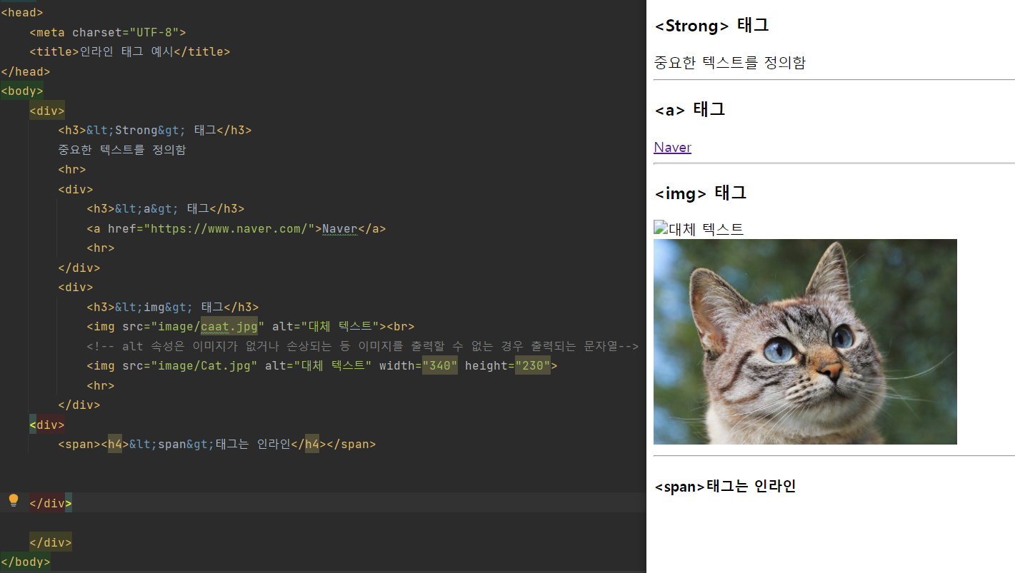 인라인 태그는 글자를 만들기 위한 태그이며 새 라인에서 시작하지 않는다.
