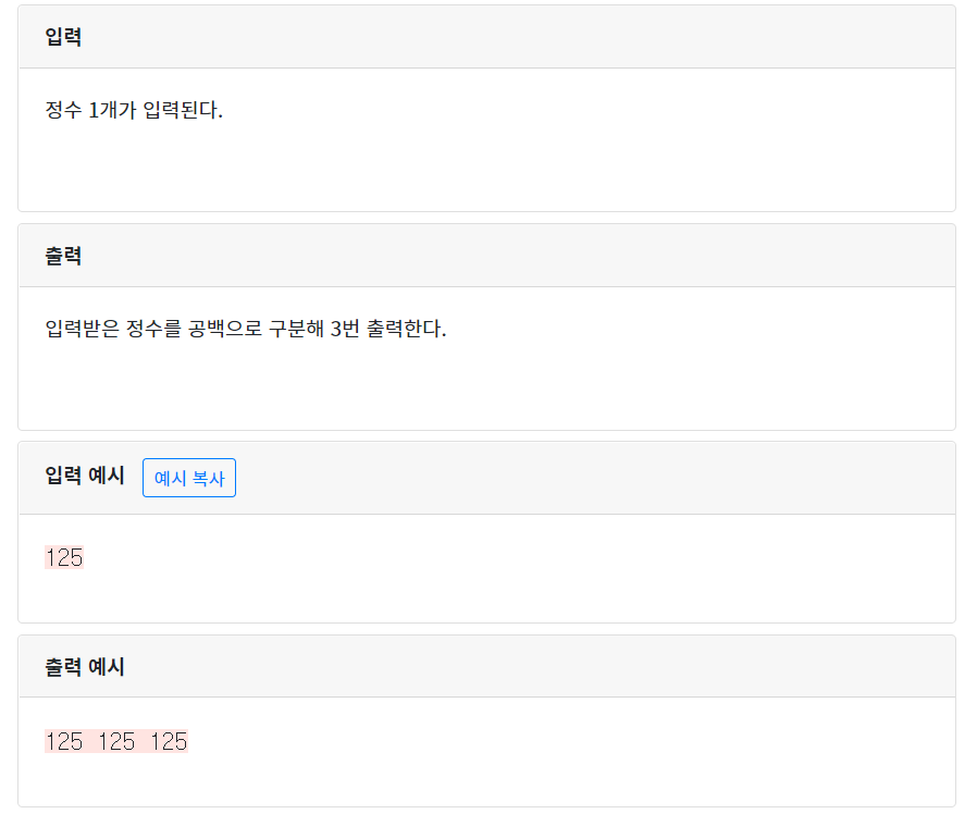 - 정수 1개 입력받아 3번 출력하기