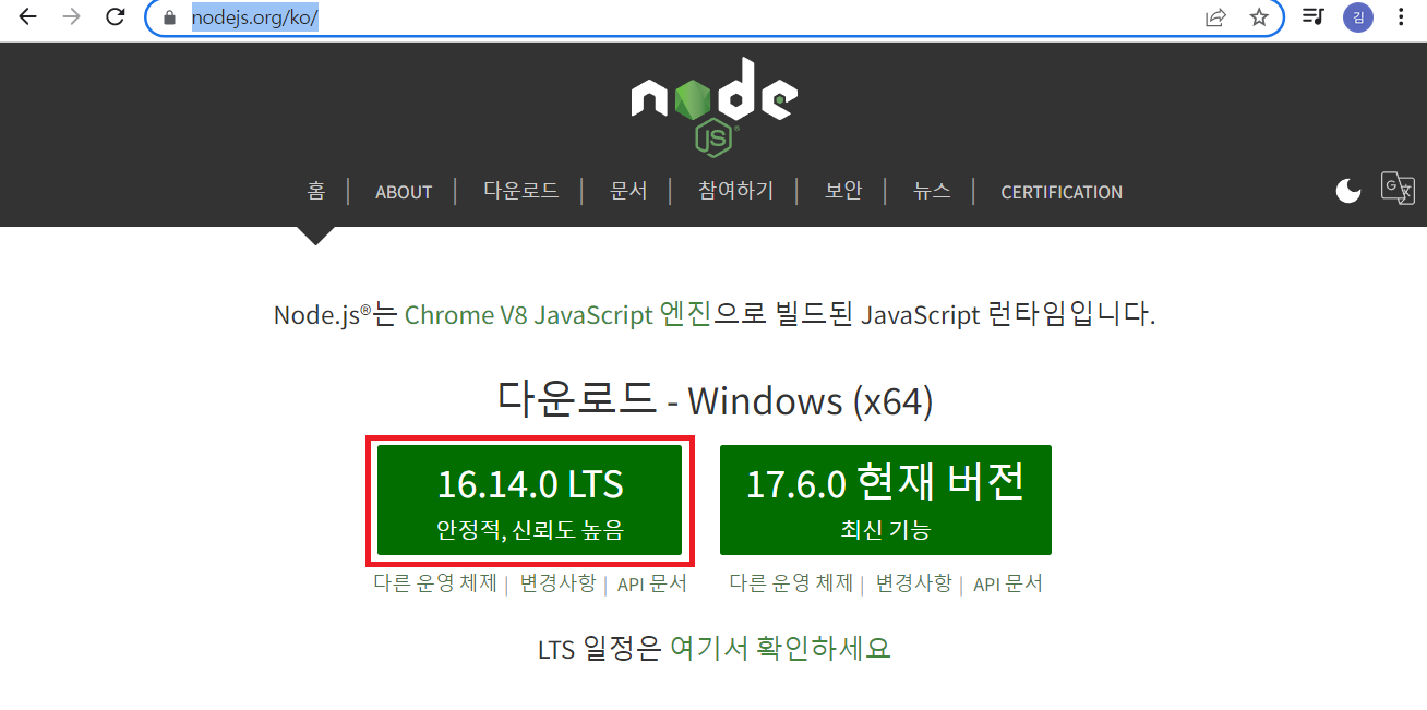 NodeJS 홈페이지 접속 후 아래와 동일하게 다운로드하면 된다.
