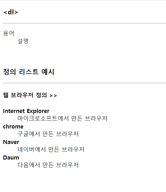- 정의 리스트 전체는 <dl>을 사용하며, 각 아이템에서 용어는 <dt>로, 설명은 <dd>로 표현함.