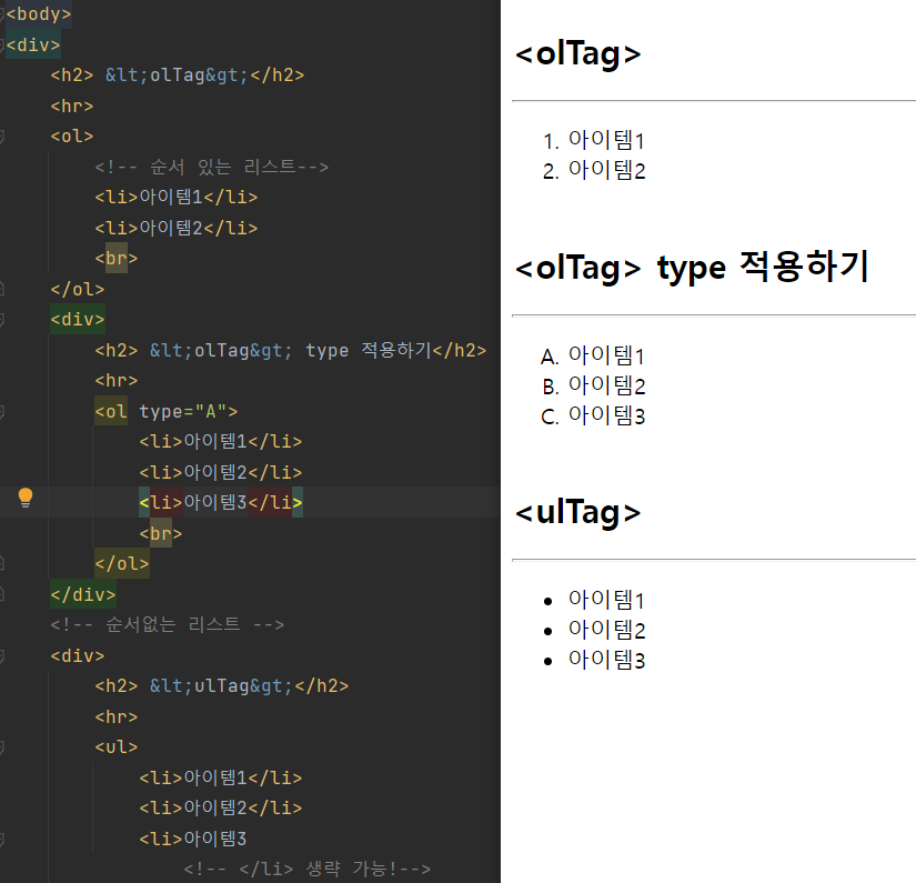 위 각 리스트는 <li> 태그를 사용하며 </li> 닫힌 태그는 생략할 수 있다.
