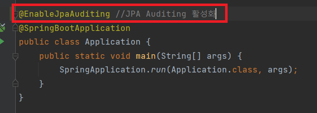 JPA Auditing 어노테이션들을 모두 활성화할 수 있도록 이전 Application 클래스에 활성화 어노테이션을 추구한다.