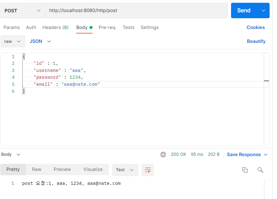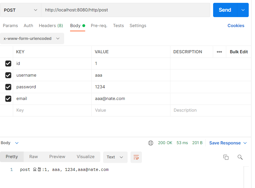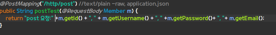 return "post 요청:" +m.getId() + ", " + m.getUsername() + ", " +m.getPassword()+ ", "+ m.getEmail();