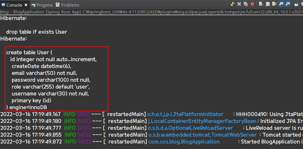 SpringBoot) 블로그 프로젝트_4.yml설정, 테이블 생성 본문