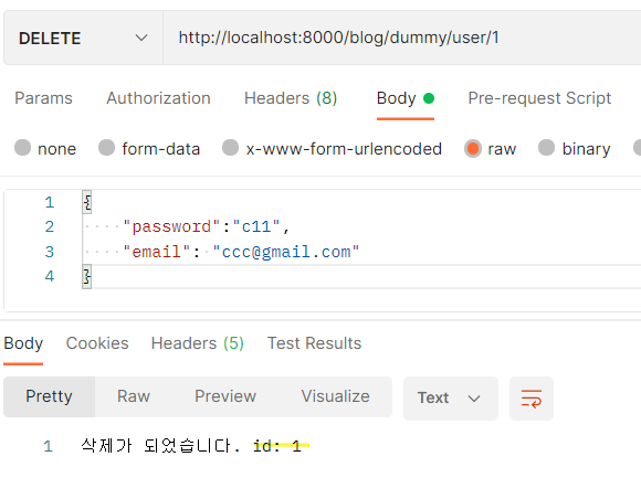 id: 1이 삭제된 걸 확인할 수 있다!!