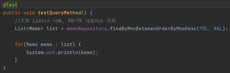 List<Memo> findByMnoBetweenOrderByMnoDesc(Long from, Long to);