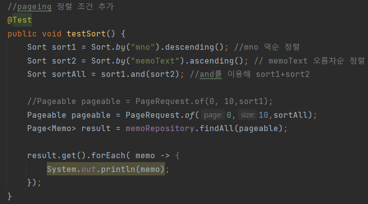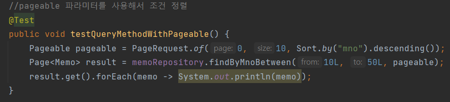 //Pageable 파라미터는 모든 쿼리 메서드에 적용, 쿼리 메서드에 정렬 조건은 생략함