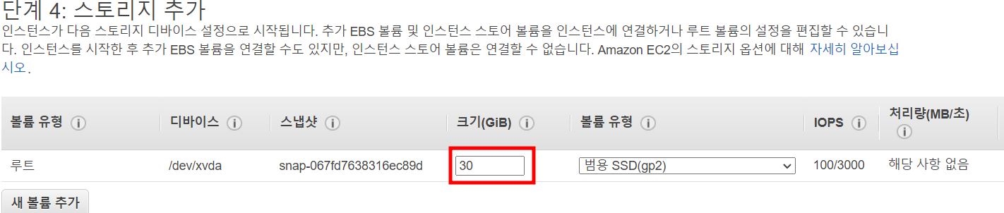 4단계인 스토리지 추가에서 크기를 30으로 변경한다.