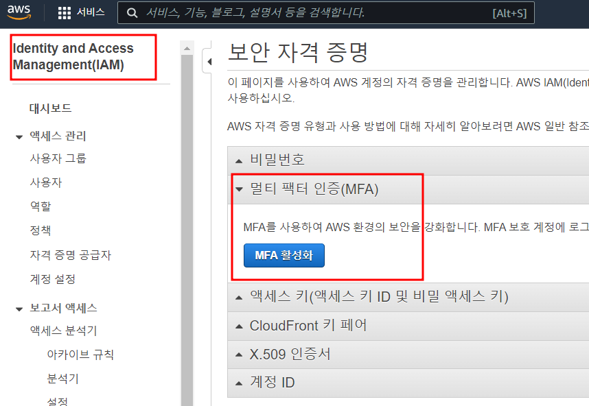 MFA는 AWS 루트 사용자 계정으로만 만들 수 있다.