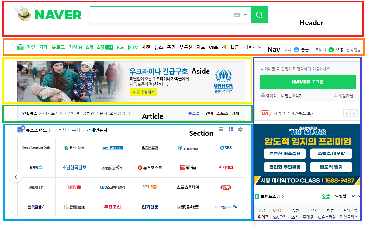 - aside : 광고, 본문과 상관없는 영역